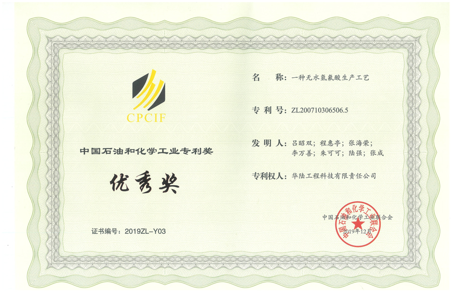華陸科技“一種無水氫氟酸生產(chǎn)工藝”發(fā)明專利喜獲“2019年度中國石油和化學(xué)工業(yè)專利獎優(yōu)秀獎”
