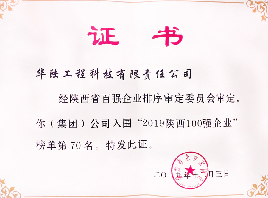 日前,陜西省企業(yè)家協(xié)會發(fā)布了2019年陜西企業(yè)100強名單,華陸科技名列第70位,這是公司連續(xù)第8年入圍陜西百強企業(yè)。